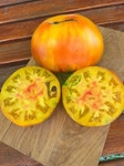 Форма: плоскоокруглі, «біфштексові» (тобто плоскі та великі). • Вага: ~150–400 г (деякі екземпляри до ~500 г). • Колір: дуже яскраві й ефектні — від жовто-оранжевого до зеленого на початку, з антроціановими (темними) плечиками або смугами залежно від сонця. • М’якоть: соковита, солодка, з густим фруктовим смаком та малою кислотністю.