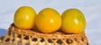 Помідори Вернісаж Жовтий дозрівають приблизно через 110-115 днів від появи перших сходів. Плоди круглої форми, жовтого кольору з зеленими штрихами. Вага – до 100 г. Шкірочка щільно прилягає до м'якоті. Смак – ніжно-солодкий, приємний, з вираженим ароматом. Основне призначення – реалізація на свіжому ринку, а також консервування. Допускається транспортування і тривале зберігання